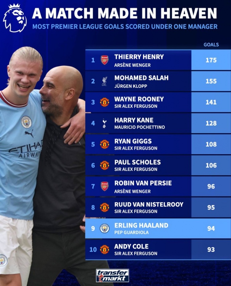 2025-10-07 00:02:34英超同一主帅治下球员进球榜:亨利175球居首,萨拉赫155球